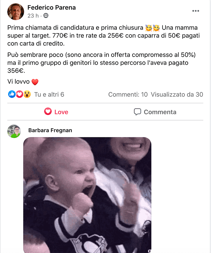 Dopo solo un mese da essere entrati nel Percorso, abbiamo generato +60.000€ di vendite, PRE-vendendo un nuovo percorso di Gruppo da 6.000€!