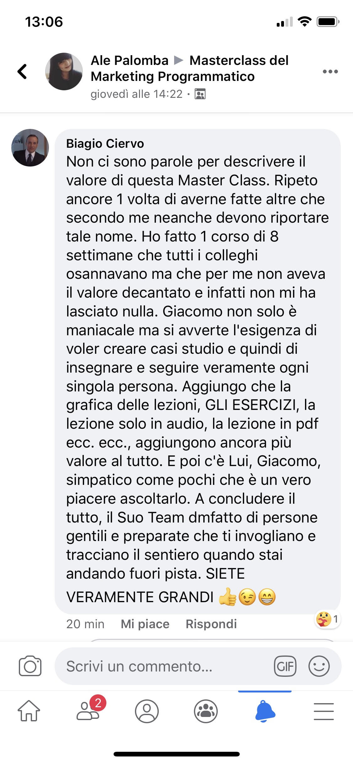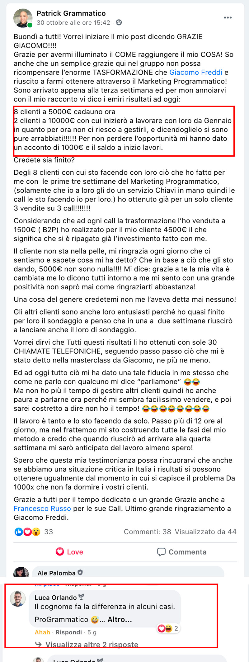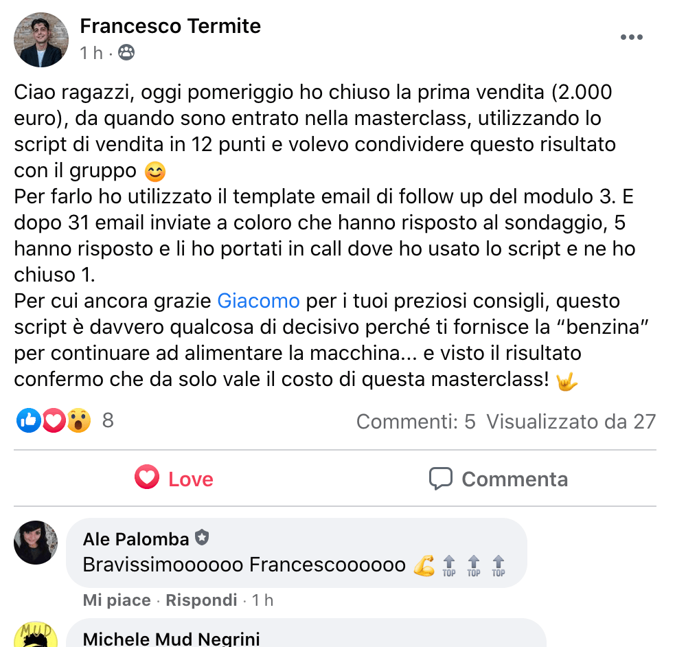 Mi sono imbattuto nel team di Giacomo e mi sono buttato tramite un finanziamento. | risultati della prima campagna sono stati INCREDIBILI: non solo ho generato 20 vendite da 1.200 euro I'una, per un totale di 24.000€ in 5 se ane. Ma la cosa piu importante & che I'ho fatto con un modello di business e pre-vendendo un nuovo servizio che non esisteva ancora (e che dopo averlo creato con i clienti vendero subito a ), e che sto gia delegando al mio team! Adesso ho la confidenza e il SISTEMA per arrivare a 1MLN / anno e aiutare 500 clienti con il mio metodo, tutto slegato dal mio tempo!